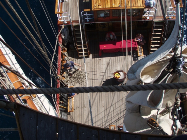 We left Copper Harbor, and the winds were very unfavorable, so we sailed for a short while, then motored on , arriving in the Apostle Islands the following morning around 4am. We anchored off Stockton Island, and after breakfast, with brisk winds, we sailed off anchor and spent the next 6 hours zigzagging thru the islands. We then sailed way out on a starboard tack intending to aim for a port tack along the south shore. It was not to be. The wind changed and we ended up back in the islands once again. After a photo opportunity (photos are in my Picasso album on Google). We motored overnight to Bark Bay on the south coast about 35 miles from Duluth, Mn. We are motoring towards Duluth to muster with the other tall ships for the entrance into the Harbor.